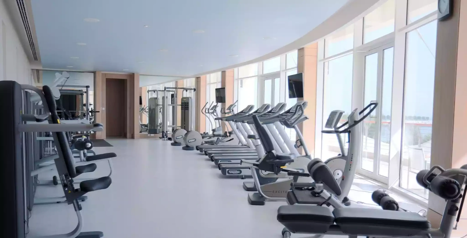 Posilňovňa je vybavená oknami od podlahy až po strop, z ktorých sa naskytá výhľad na more počas cvičenia na bežiacich pásoch a rotopedoch.