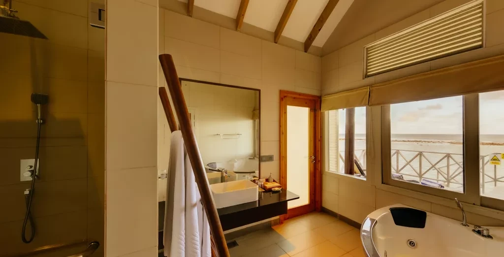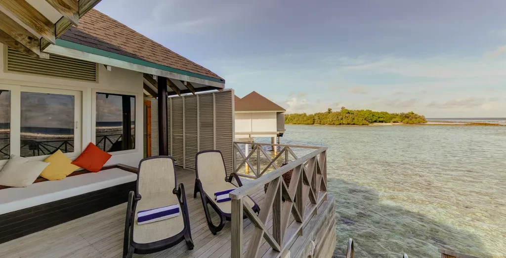 Uniknite do pokoja vášho vodného bungalovu, kde sa luxus stretáva s nekonečným horizontom. Zobuďte sa s úchvatným panoramatickým výhľadom cez rozsiahle arkýrové okná a potom si doprajte relaxačný kúpeľ. Vyjdite na terasu a vychutnajte si priamy prístup k lagúne, ktorá vás pozýva dopriať si čistý pokoj – nenútenú zmes elegancie a pohody naboso.