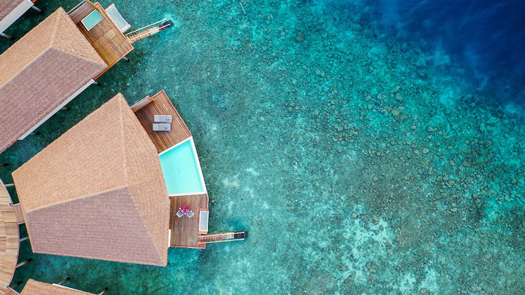 Water Bungalows – bungalovy s rozlohou 100 m² umiestnené pozdĺž móla v tvare raje nad lagúnou. Vychutnajte si výhľad na oceán a priamy prístup k oceánu z vonkajšej terasy, plus hojdaciu sieť. Kapacita pre maximálne štyroch hostí, s dvoma ďalšími samostatnými lôžkami k dispozícii.