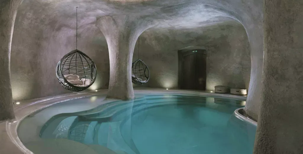 Sú tri. Krytý kúpeľný bazén (otvorený od 10:00 do 18:00) má fantastické prostredie: kamenná jaskyňa s oblými stenami, rímske schody na posed a hojdacie stoličky, v ktorých sa môžete hojdať. Vonkajší bazén pre hlavné podujatia na vnútornom nádvorí hotela je dostatočne veľký na plávanie bez prerušenia a je obklopený nadrozmernými sedacími vakmi, ležadlami zapustenými do paluby.
