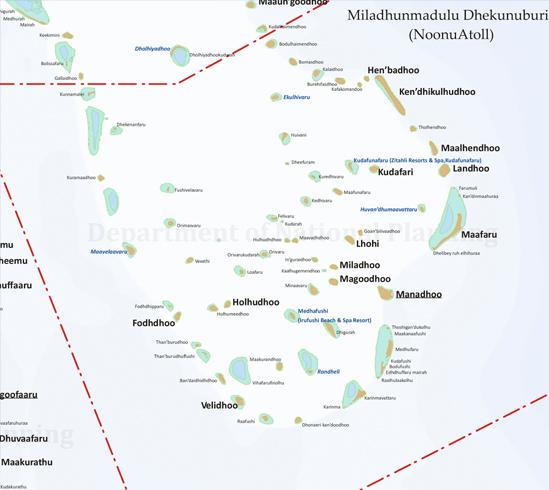 Atol Noonu je najjužnejšou časťou rozsiahleho atolu Miladhunmadulu. Skladá sa zo 71 ostrovov a ostrovčekov, z ktorých 13 je obývaných.