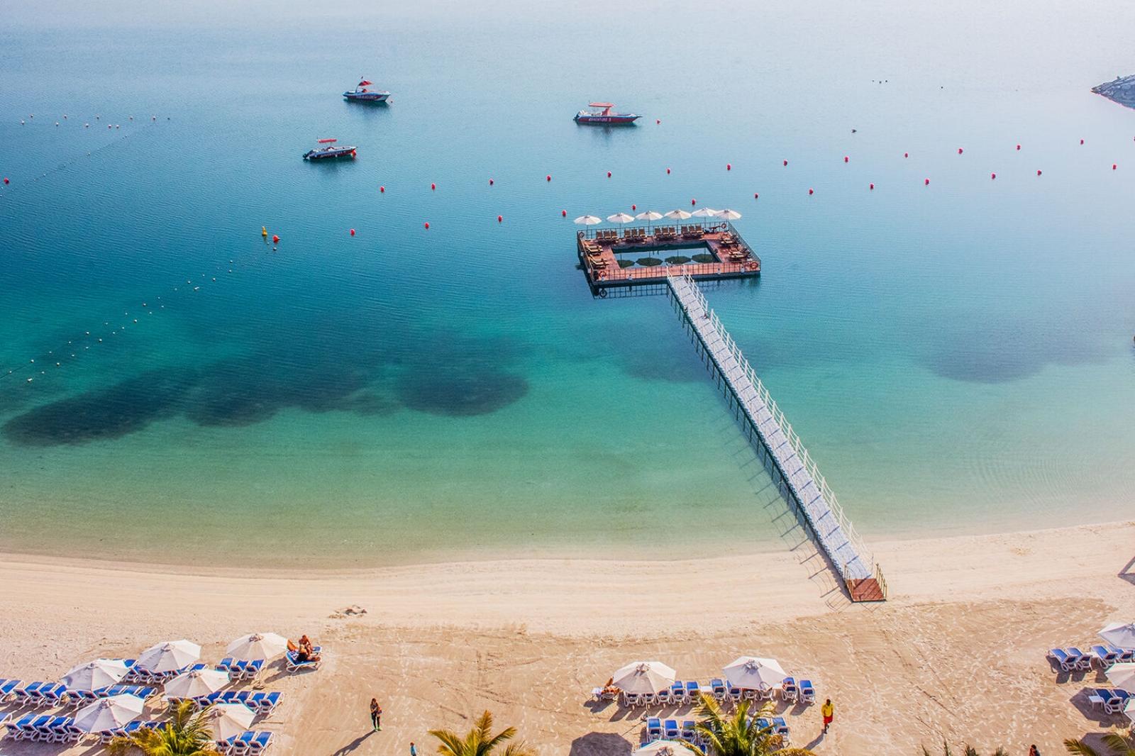 600 m dlhá piesočnatá pláž priamo pred hotelom • na umelo vybudovanom ostrove Marjan • pozvoľný vstup do mora • s výhľadom na Ras al Khaimah • ležadlá, slnečníky a plážové osušky zdarma • The Bay Club má vyhradenú pláž len pre hostí z tejto časti hotela • vodné športy na pláži za poplatok • pirátska loď