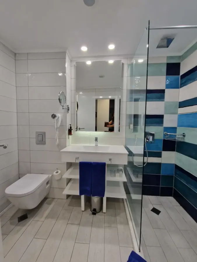 Dvojlôžkové izby s možnosťou 1 prístelky majú súkromné zariadenia (kúpeľňa so sprchou, fén, WC), klimatizáciu, SAT/TV, WiFi, telefón, trezor, minibar (doplňovaný denne), súpravu na prípravu čaju a kávy, balkón s výhľadom na okolie. Za príplatok izby s výhľadom na more.