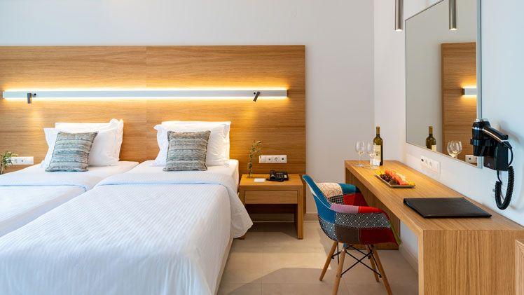 Všetky izby sú plne vybavené: manželská alebo 2 oddelená postele Ultra King, antialergický ortopedický matrac, 100% bavlnená posteľná bielizeň, 100% bavlnené uteráky, vankúšové menu, plážové osušky, individuálne nastaviteľná klimatizácia, balkón alebo terasa, 2 telefóny (spálňa, kúpeľňa), satelitná 43-55-palcová satelitná TV, príslušenstvo na prípravu kávy a čaju, kávovar Nespresso® (denné dopĺňanie), minerálna voda (denné dopĺňanie), vlastná kúpeľňa so sprchovacím kútom, sušičom vlasov, županom a papučami, značkové toaletné potreby. Všetky suity Deluxe majú navyše priestor na posedenie, hydromasážnu vaňu a samostatný sprchovací kút. Pri príchode je pre vás pripravený bezplatný balíček s minerálnou vodou, fľašou krétskeho vína, nealkoholickými nápojmi a občerstvením. Vyberte si medzi izbami Deluxe s manželskou posteľou, suitami Deluxe s výhľadom do záhrady, suitami Deluxe s výhľadom na more, suitami Deluxe Swim Up a suitami Deluxe Beachfront