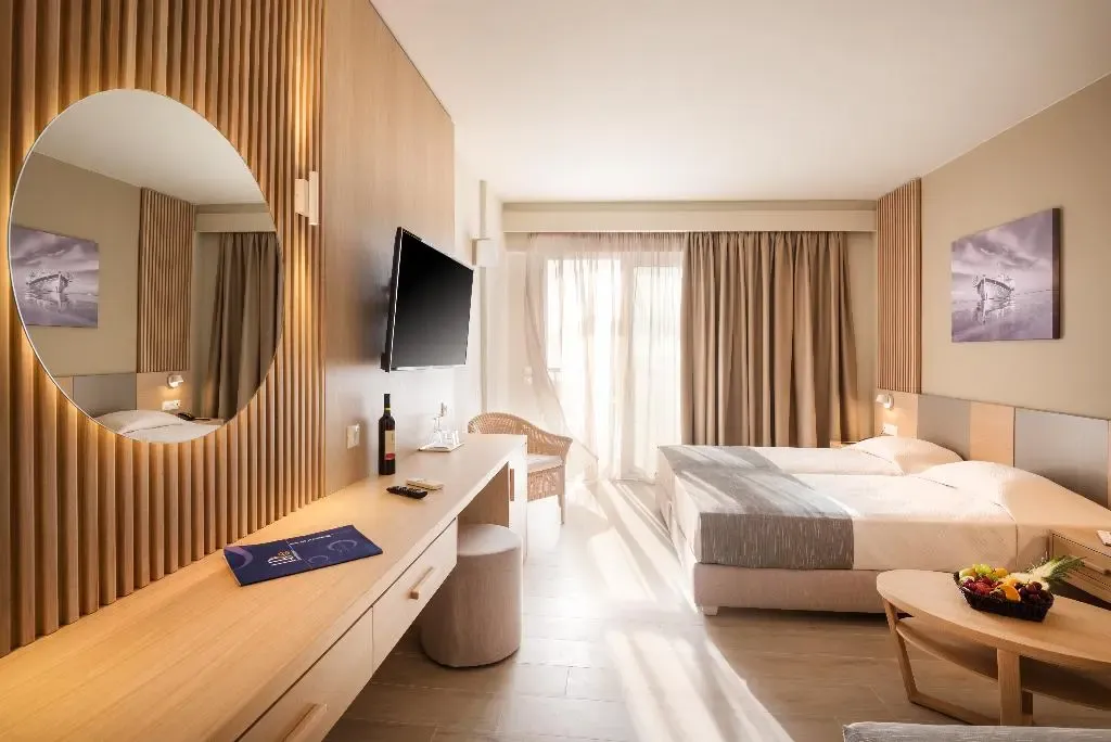 Dvojlôžkové izby sa môžu pochváliť veľkými súkromnými balkónmi s úžasným výhľadom na Egejské more a/alebo úžasné svieže záhrady.