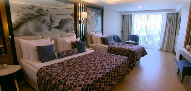 Hosťovské izby a suity kombinujú svetlý a vzdušný dekor s farebnými akcentmi a množstvom uvítacích prvkov. Uverejnite svoje fotografie z dovolenky na sociálnych sieťach pomocou bezplatného Wi-Fi, ponorte sa do filmu na satelitnej LCD televízii a vyjdite na balkón a sledujte svet s drinkom v ruke. Vyberte si z dvojlôžkových a rodinných izieb, všetky s klimatizáciou a zariadeným balkónom s výhľadom na more alebo pevninu. Všetky izby sú skutočne priestranné a zariadené v elegantnom, modernom štýle, takže budete mať pohodlne priestor na oddych a relax. Tento hotel na pláži Lara má celkovo 606 moderných izieb Standard, Family a Suite. Štandardné izby sú vybavené klimatizáciou, telefónom, príslušenstvom na prípravu kávy/čaju, minibarom, sušičom vlasov, Wi-Fi pripojením, LCD TV so satelitným príjmom, minibarom, trezorom, županom a papučami, kúpeľňou so sprchou a balkónom.