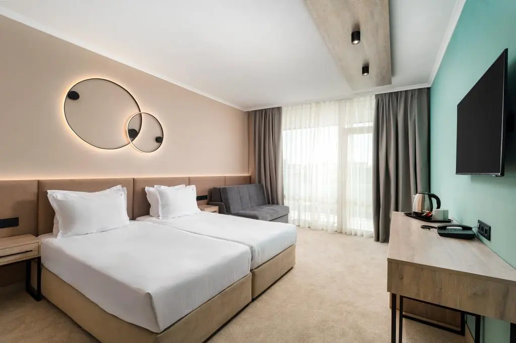 Hostia budú mať prístup do vyhrievaného krytého bazéna, vírivky, parného kúpeľa a rôznych sáun a vaní, ako aj do masáží a procedúr za príplatok. Udržujte si svoju kondíciu počas pobytu a využite dve dostupné posilňovne - jedna z nich sa nachádza v relaxačnej zóne a druhá, pouličná posilňovňa, sa nachádza vonku s výhľadom na záliv Slnečného pobrežia. Prípadne si môžete vyskúšať rôzne športy vrátane volejbalu!