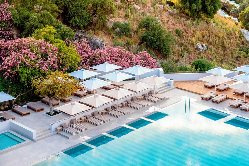 Hotel Lindos Mare, postavený na útese, má skvelú gastronomickú scénu a panoramatický výhľad na Egejské more.