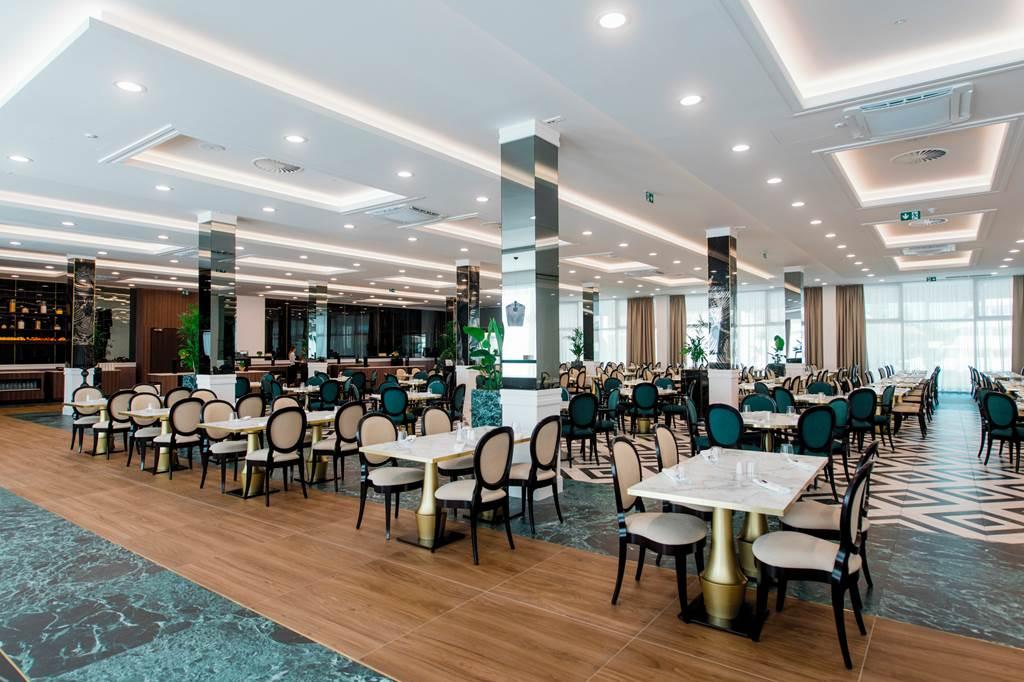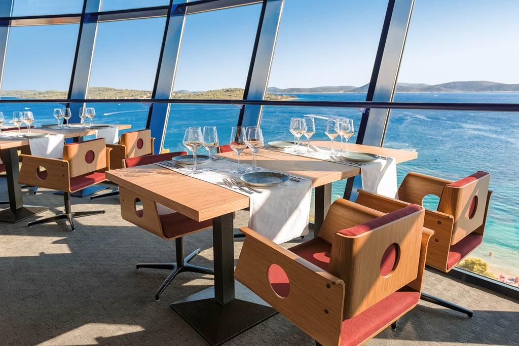 Reštaurácia Sky a la Carte - nachádza sa na 10. poschodí, okná od podlahy až po strop ponúkajú úžasný výhľad na šumivé more a mesto Vodice.