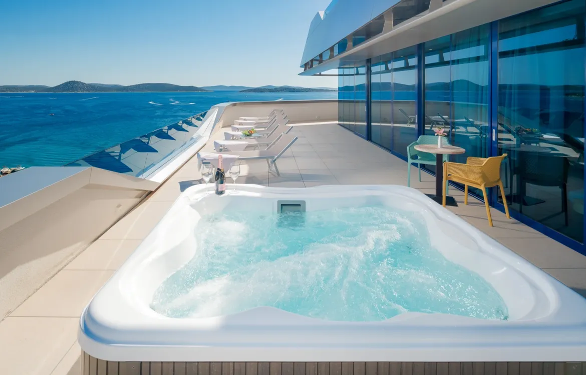 Grand Spa Suite, obklopený priestrannými terasami a presklenými stenami od podlahy až po strop, ponúka nádherný panoramatický výhľad na krištáľovo čisté more a malebné ostrovy. Okrem úchvatnej scenérie si hostia môžu oddýchnuť vo svojej súkromnej vonkajšej vírivke, ktorá vytvára dokonalé útočisko pre úplnú relaxáciu.