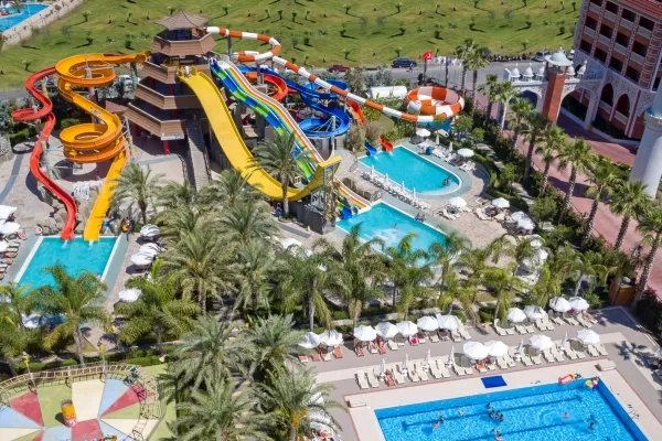 Tento nádherný komplex, ktorý sa môže pochváliť vynikajúcou polohou na ploche 40 000 m², ponúka architektonický štýl pripomínajúci aspekty indického Taj Mahalu, ktorý poteší aj tých náročnejších návštevníkov. Tí, ktorí hľadajú relax, môžu využiť pohodlie kúpeľného a wellness centra s nespočetnými tureckými a thajskými procedúrami a masážami.