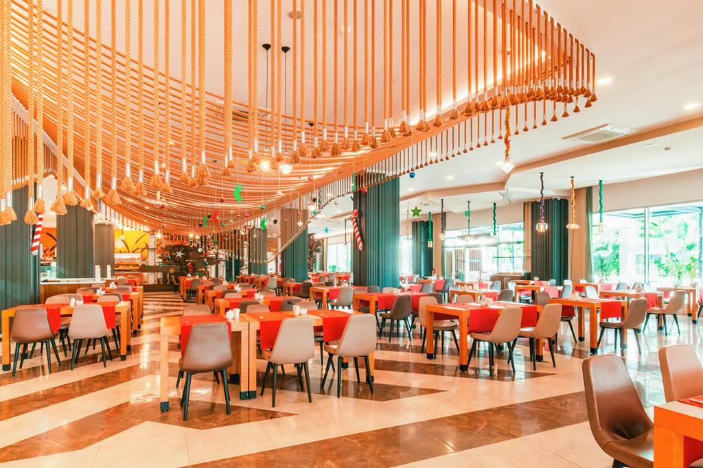 skoré raňajky (06:00-07:00 h), raňajky (07:00-10:00 h), neskoré raňajky (10:00-10:30 h), obedy v hlavnej reštaurácii (12:30-14:00 h), obedy na pláži (12:00-15:00 h), večere formou bufetových stolov (19:00-21:00 h) • popoludňajší snack, káva, čaj, koláče, zmrzlina, wafle, gözleme • nočný bufet (22:00–02:00 h) • skoré raňajky (02:00-06:00 h) • miestne alkoholické, nealkoholické a niektoré importované nápoje v určenom čase • pool bar 24h