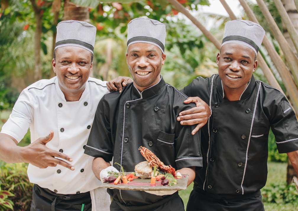 Reštaurácia Cobia je pozoruhodná budova so stúpajúcou strechou s makuti slamenou strechou, ktorej vplyvu zodpovedá aj kuchyňa, ktorá je na vysokej úrovni a krásne prezentovaná. Ponúka široký sortiment medzinárodných jedál s pridaním miestnych surovín a korenín, z ktorých mnohé sa pestujú na hotelovej farme. Súčasťou baru je TV miestnosť, kde sa premietajú športové podujatia, a podáva sa tu vynikajúci výber miestnych a medzinárodných nápojov.