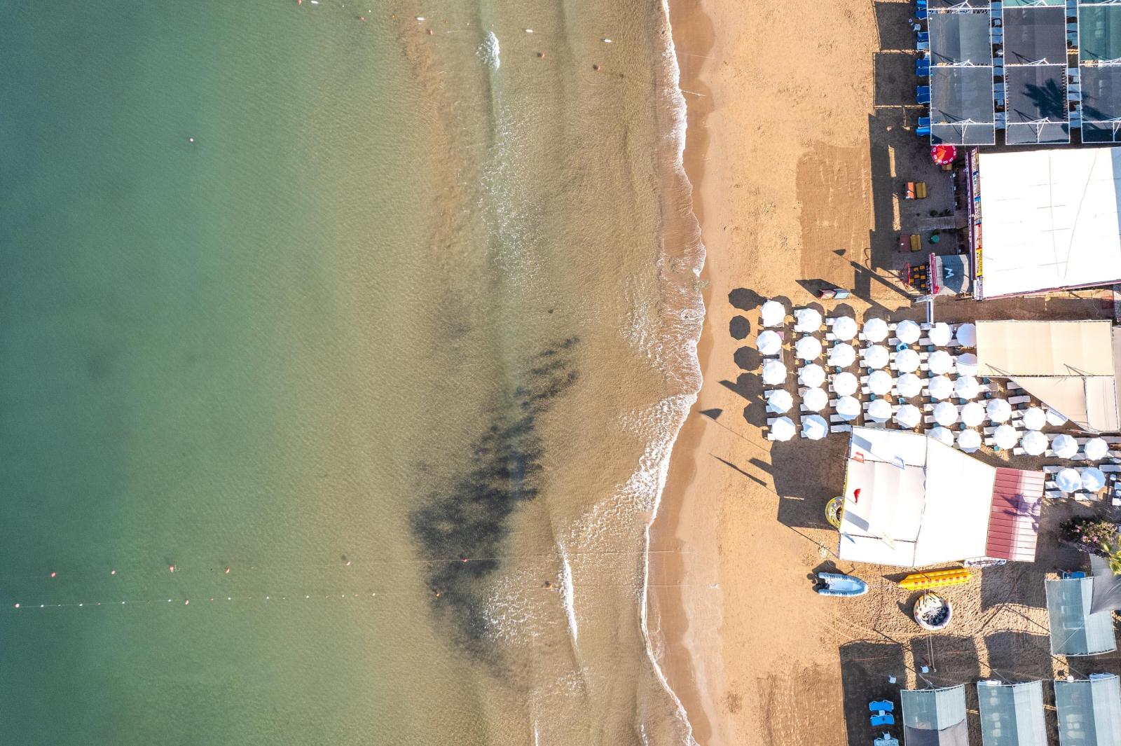Cca 450 m od hotela (prístupný cez podchod nostalgickým "metrom" priamo z hotela zadarmo), piesočnato-kamienková pláž, lehátka, slnečníky, matrace a osušky zadarmo, plážový bar je k dispozícii v rámci Ultra All Inclusive, plážové pavilóny za poplatok.