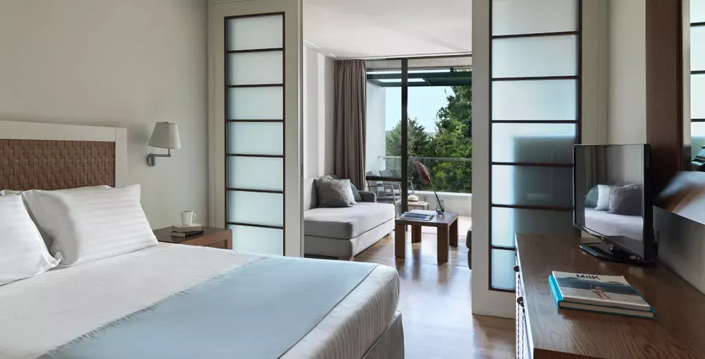 Široká škála možností ubytovania zahŕňa izby v hlavnej budove, bungalovy obklopené záhradami rezortu a luxusné suity. V dekorácii izieb prevládajú zemité tóny s množstvom béžových, sivobielych, hnedých závesov, dreveným a čalúneným nábytkom, manželskými posteľami alebo oddelenými posteľami, pohovkami, kúpeľňou s vaňou alebo sprchovacím kútom a zariadenou súkromnou terasou alebo balkónom s malebným výhľadom na svieže záhrady alebo more a krajinu Korfu. Všetky izby sú vybavené vlastnou kúpeľňou so sušičom vlasov, bezpečnostnou schránkou, satelitnou TV, bezplatným Wi-Fi pripojením na internet, klimatizáciou, telefónom, minibarom, príslušenstvom na prípravu čaju a kávy, ako aj zariadeným balkónom alebo terasou. V ponuke sú výhľady do záhrady, na záliv alebo more, ako aj rodinné izby a možnosť polosúkromného bazéna.