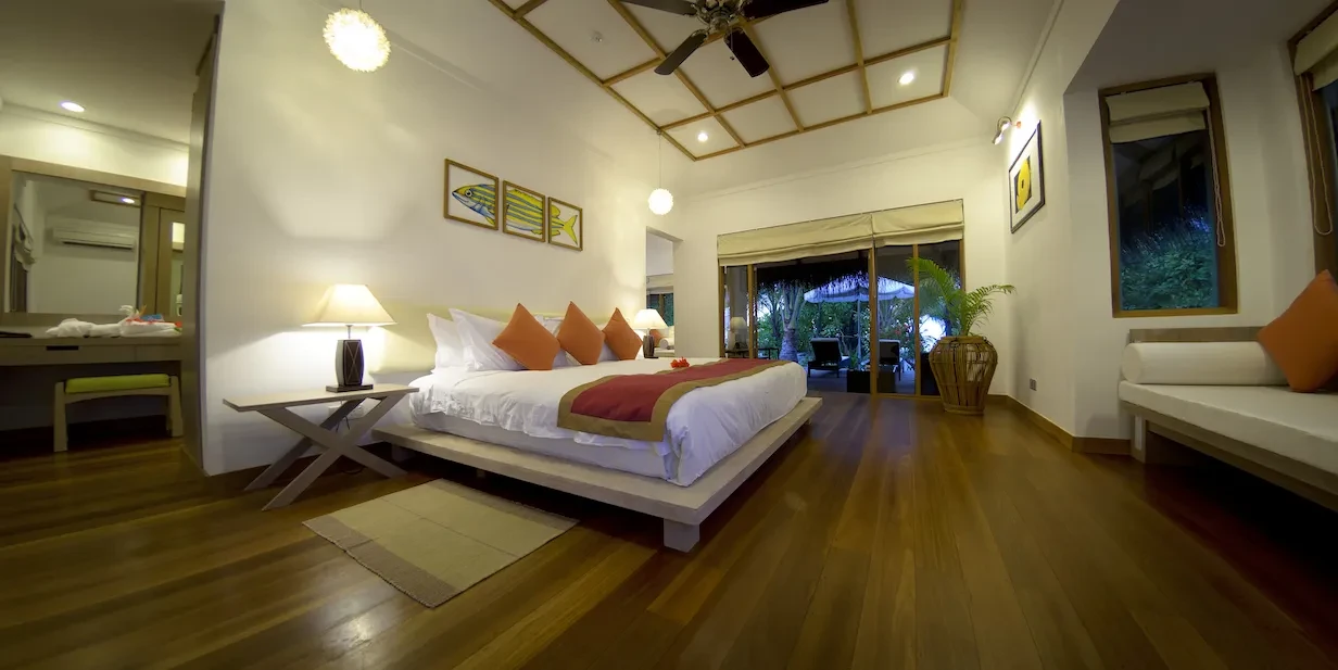 Oslavujte romantiku. Doprajte si tieto luxusné vily. Drevený plážový bungalov, umiestnený uprostred prírodných záhrad ostrova, je venovaný párom oslavujúcim romantiku. Spálňa je vybavená posteľou s nebesami veľkosti king a príjemnou dennou posteľou, zatiaľ čo vonkajšia terasa ponúka dennú posteľ a ležadlá pre dvoch. Kúpeľňa je veľká a otvorená a v rohu sa nachádza lákavá vírivka.