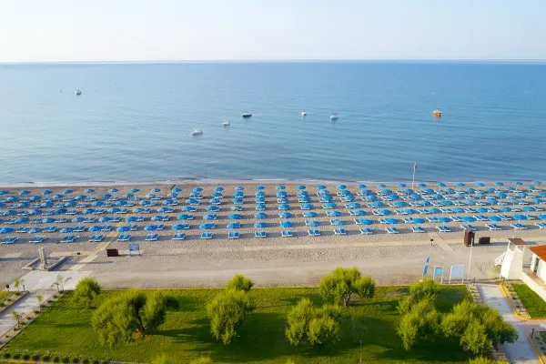 priamo na pláži • piesočnato-kamienková pláž (odporúčame obuv do vody) • pozvoľný vstup do mora • slnečníky, ležadlá a plážové uteráky (zdarma) • vodné športy (za poplatok) • plážový bar