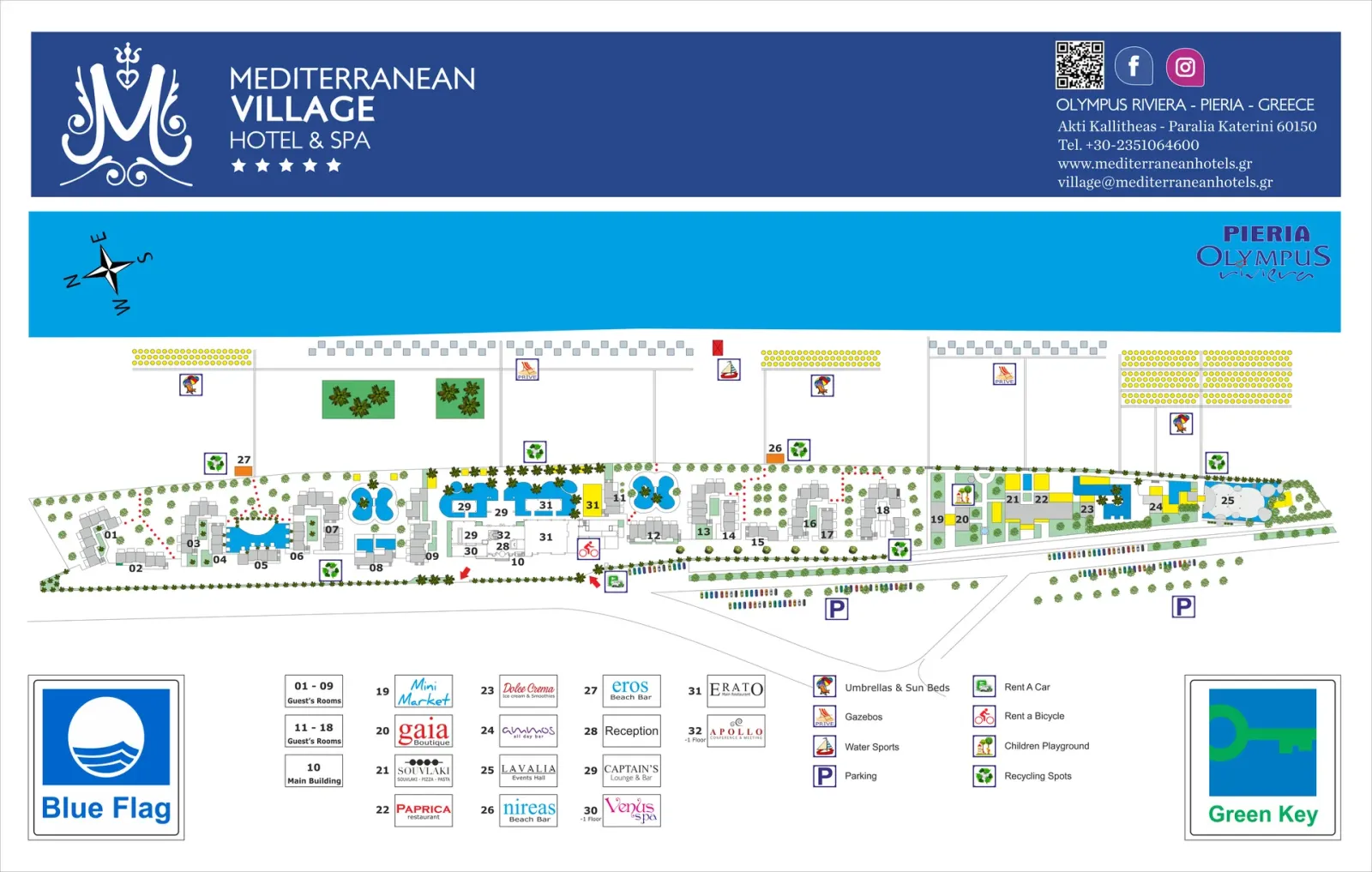 Mediterranean Village Hotel & Spa, ultramoderný päťhviezdičkový hotel priamo pri mori, postavený na stopách legendárneho Olympu a nachádza sa na pláži Olympskej riviéry, ponúka kombináciu vysokej kvality služieb, vynikajúceho ubytovania a skvelej pohostinnosti. Hotel sa nachádza len 700 m od mesta Paralia a 7 km od mesta Katerini.