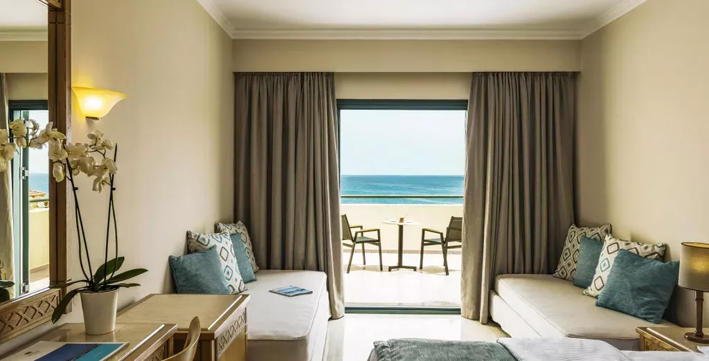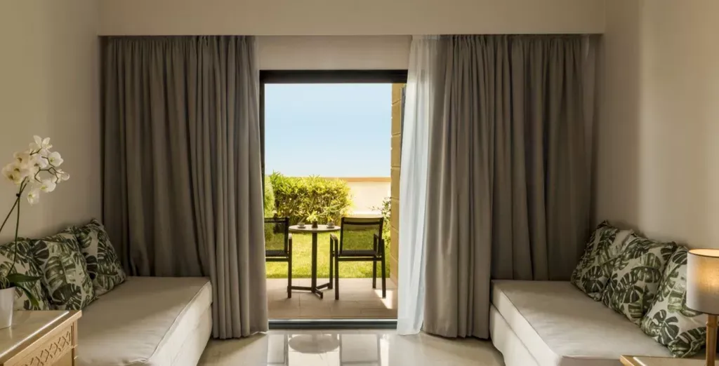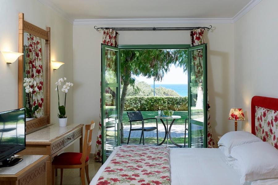 Izby s nádychom zelenej a modrej. Mitsis Rodos Maris ponúka široký výber izieb pre akýkoľvek typ hostí, od jednolôžkových izieb, dvojlôžkových izieb, izieb s bungalovmi, rodinných izieb, dvojposchodových mezonetov a suít. Každá s výhľadom do záhrady alebo na more, buďme spravodliví, všetci milujeme výhľad na more, ale výhľady do záhrady sú tiež úžasné