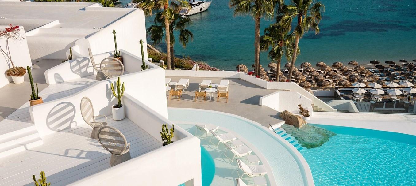 Čo majú spoločné Johnny Depp, Giorgio Armani a Brigitte Bardot? Všetci podľahli čaru Mykonosu, ostrova, ktorý stelesňuje krásu gréckych ostrovov. Malé dláždené uličky, biele domy, veterné mlyny: každá scéna je hodná pohľadnice. Pridajte pláže hodné snov, krištáľovo čistú vodu a jemný vánok na zmiernenie tepla slnka a máte ideálnu dovolenku. Už príchod na Mykonos sľubuje výnimočnú dovolenku, ale odložiť si kufre v pokojnom Mykonos Blu Grecotel Resort znamená užiť si to najlepšie z najlepšieho.