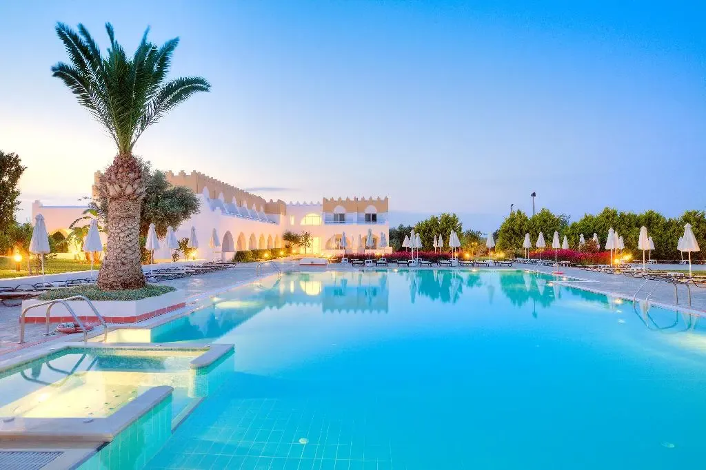 Tento pozoruhodný hotel vám dá rozprávkovú atmosféru vďaka oblúkom a cimburiu v jeho výraznej architektúre. Nachádza sa na pokojnom mieste, kúsok od pláže (kde má hotel niekoľko lehátok vyhradených pre hostí) a krátku jazdu alebo jazdu na bicykli do starého mesta Kos. V hoteli sú dva veľké bazény, z ktorých jeden má priľahlú vírivku a bar pri bazéne. Počas dňa si môžete zahrať vodné pólo a plážový volejbal, prípadne nájdete aj organizované futbalové zápasy a stolný tenis. K dispozícii je aj minigolf, tenis, detské ihrisko a posilňovňa, hoci ak chcete niečo trochu relaxačnejšie, k dispozícii sú aj kúpeľné procedúry.