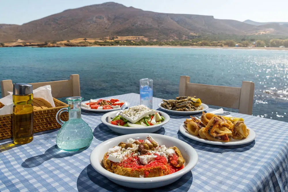 Ryby a morské plody sú veľmi žiadané na všetkých troch ramenách, ryby sú vždy čerstvo pripravené. Nájdete tu aj kozí syr, neodmysliteľný olivový olej, ale aj víno a tsipouro, špecifický nápoj, ktorý je tu vysoko cenený.