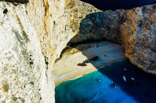Zakynthos Shipwreck alebo Navagio Bay: Pláž Navagio alebo Shipwreck je najznámejšia pláž na Zakynthose, ktorá sa nachádza na západnej strane Iónskeho ostrova, v blízkosti dediny Anafotiria. Vrak lode je jednou z najfotografovanejších turistických atrakcií v Grécku. Je považovaná za jednu z najlepších pláží v Grécku. Pôvodne sa volala Agios Georgios, ale za svoj nový názov vďačí stroskotaniu lode, ktorá prevážala nelegálne cigarety v roku 1983. Loď bola v priebehu rokov vyplavená na breh, keď ju piesok úplne obklopil. Pozostatky lode je možné vidieť uprostred veľkej pláže s bielym pieskom, ktorá má ohromujúcu tyrkysovú a krištáľovo čistú vodu. Obrovské vertikálne útesy bielych skál obklopujú piesok a vytvárajú jedinečný a očarujúci obraz. Aby ste sa dostali do tohto raja, musíte si vziať malú loď z malého prístavu Porto Vromi. Tieto taxíky odchádzajú každú hodinu a cesta trvá asi 30 minút.