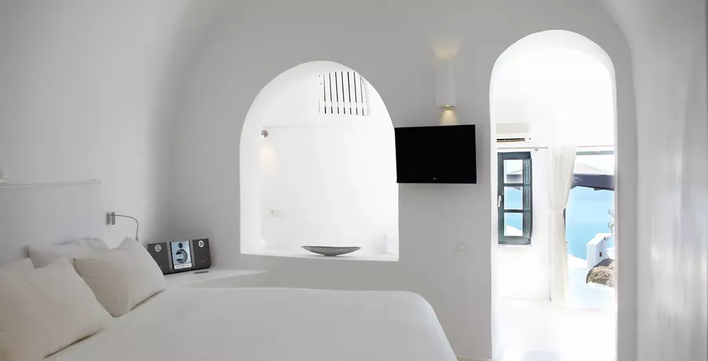 Izby Superior Deluxe, Luxusná suita, Suita Experience, Suita Honeymoon, Suita Sun Rocks a Suita Exclusive Cave – každá izba a suita vzdáva hold tradičným bielym budovám v gréckom štýle, má malebný výhľad na more a technické vybavenie