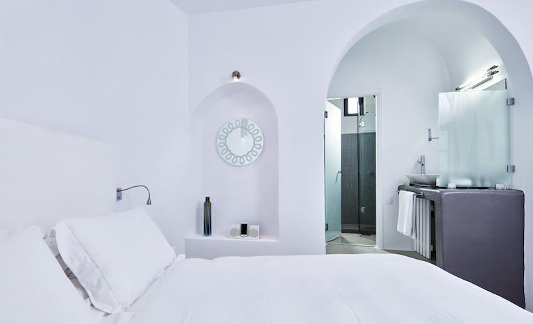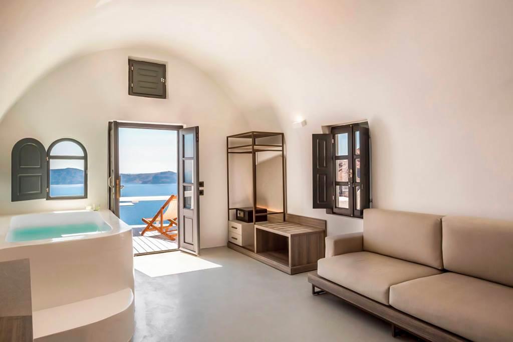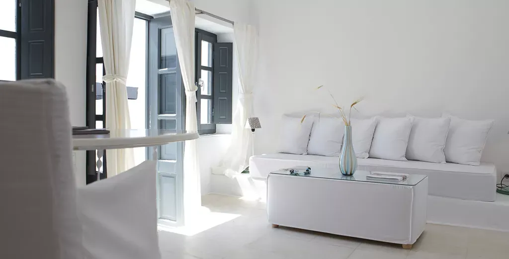 Sofistikované suity Junior pozostávajú z oddelenej spálne s posteľou queen size, obývacej izby, kamienkovej kúpeľne so sprchovacím kútom a verandy s nádherným výhľadom na kalderu.