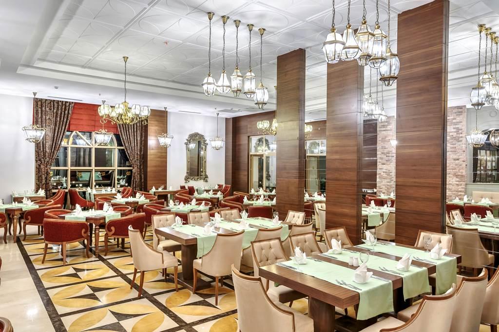 hlavná reštaurácia s terasou • obedová reštaurácia • osmanská a la carte reštaurácia • a la carte reštaurácia s morskými plodmi • mexická a la carte reštaurácia • talianska a la carte reštaurácia • ázijská a la carte reštaurácia • sushi bar • snack bar pri bazéne • tradičné turecké pide • cukráreň • 2 lobby bary • bar pri bazéne • bar na móle • írsky bar • turecká kaviareň • disco bar
