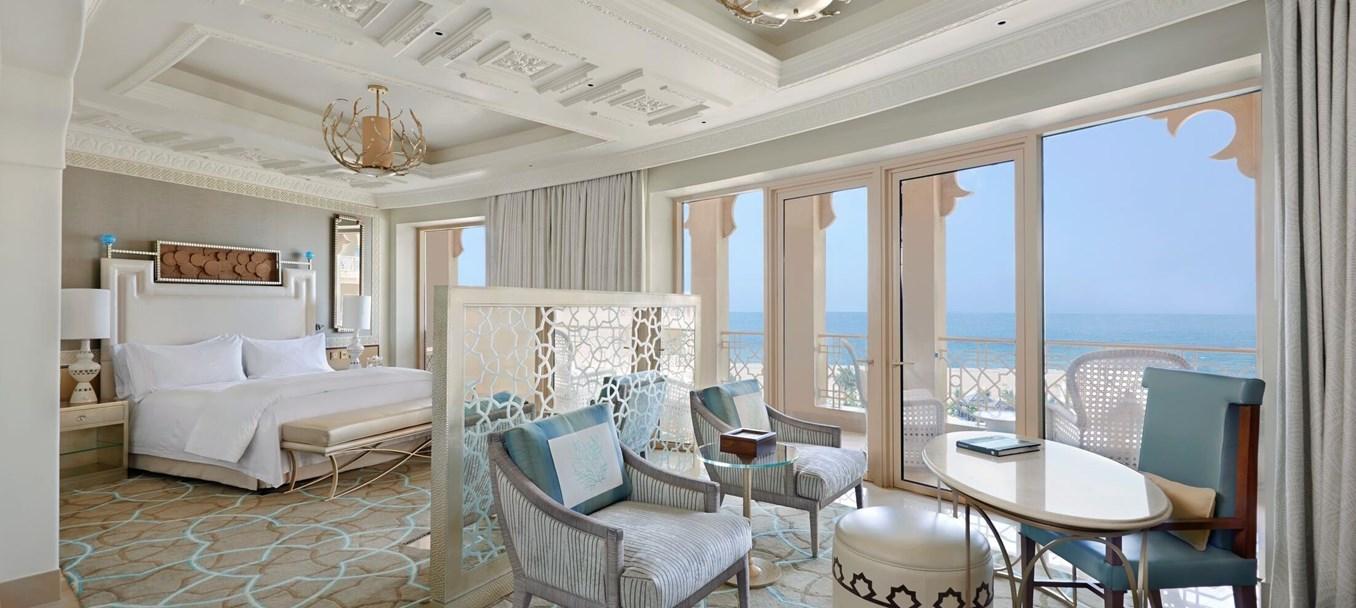 346 priestranných klimatizovaných luxusne a štýlovo zariadených izieb s koloritom Waldorf • s rozlohou od 56 m² s nádherným výhľadom na záliv, golfové ihrisko alebo na pohorie Hajar • kúpeľňa • kúpacie plášte • minibar • MP3 prehrávač • HD TV • trezor • rádio • DVD a CD prehrávač • zriadenie na prípravu kávy a čaju • WiFi zdarma • izby Classic (od 56 m²) • dizajn inšpirovaný palácmi Arabského polostrova izby • izby Family classic, možnosť ubytovania rodín s dvomi deťmi • izby Deluxe golf view (76 m²) • s výhľadom na golfové ihrisko • priestranný balkón so sedením • izby Deluxe sea view (od 84 m²) • s výhľadom na more • priestranný balkón so sedením